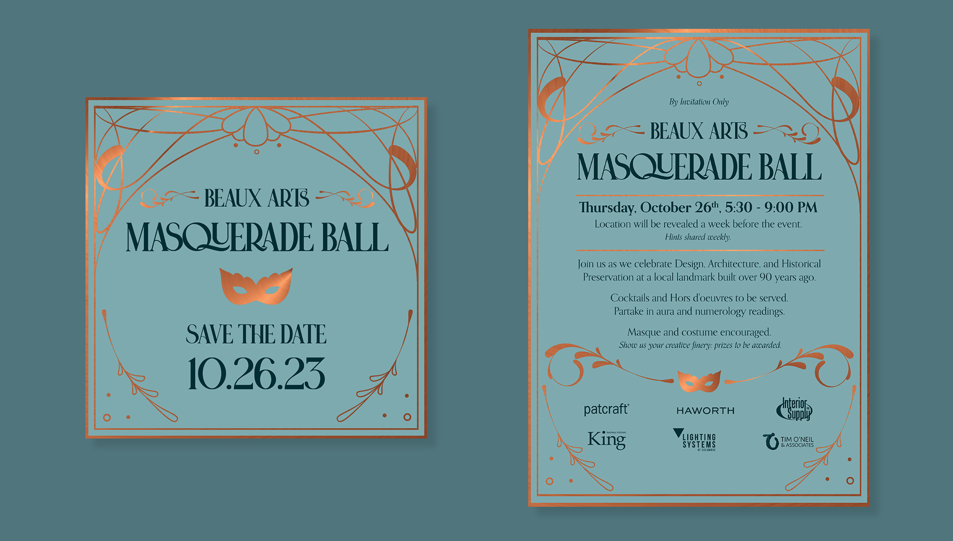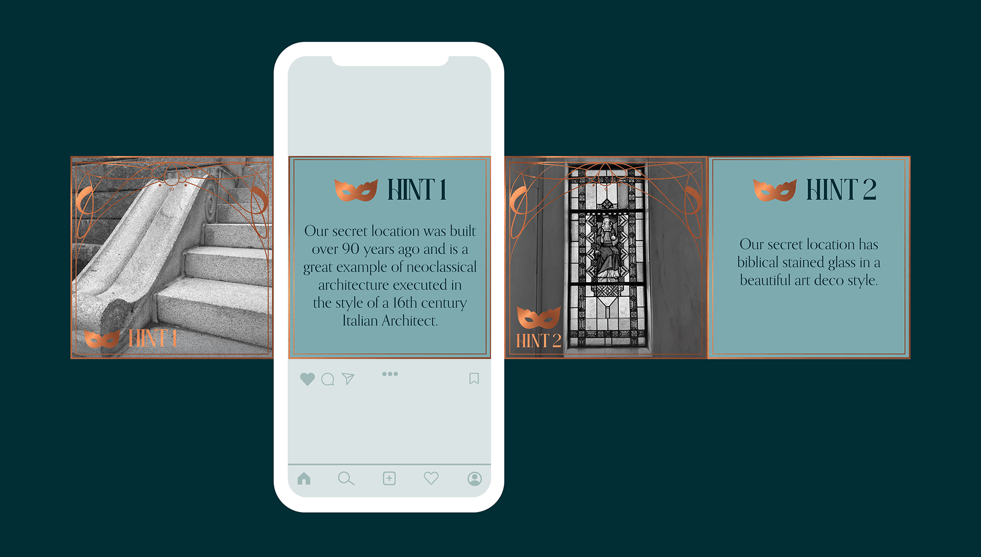 After designing the save the date and invite, I worked with their team to design colalteral that would promote the event and generate interest. To build excitement for the return of the masquerade, the hosts kept the location a secret from their attendees. I created an email marketing and social media campaign that dripped hints and clues about the event location that encouraged attendees to interact with posts and guess where they thought the ball would be hosted. We built this excitement into a reveal of the historic location two weeks before the event.
