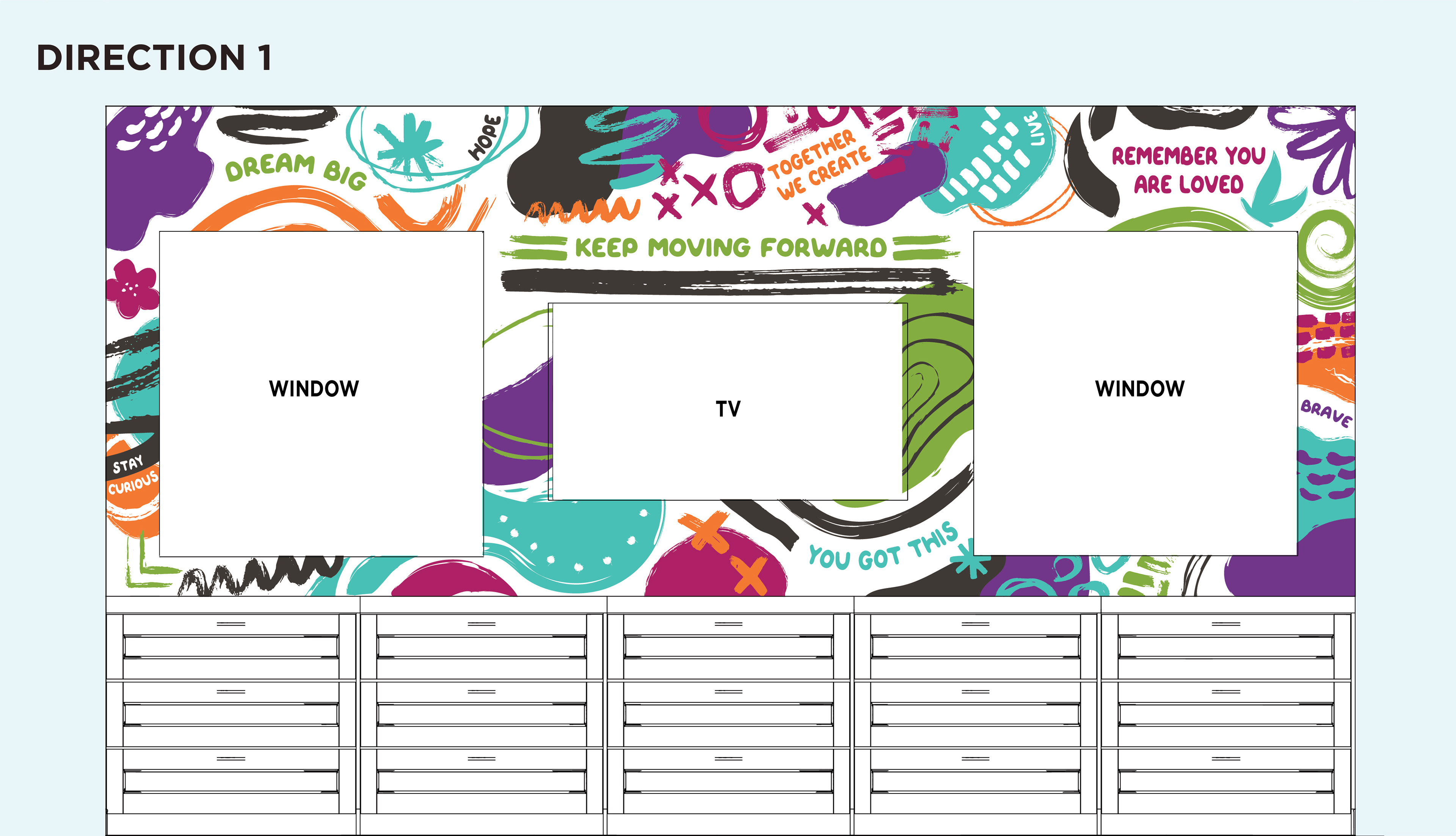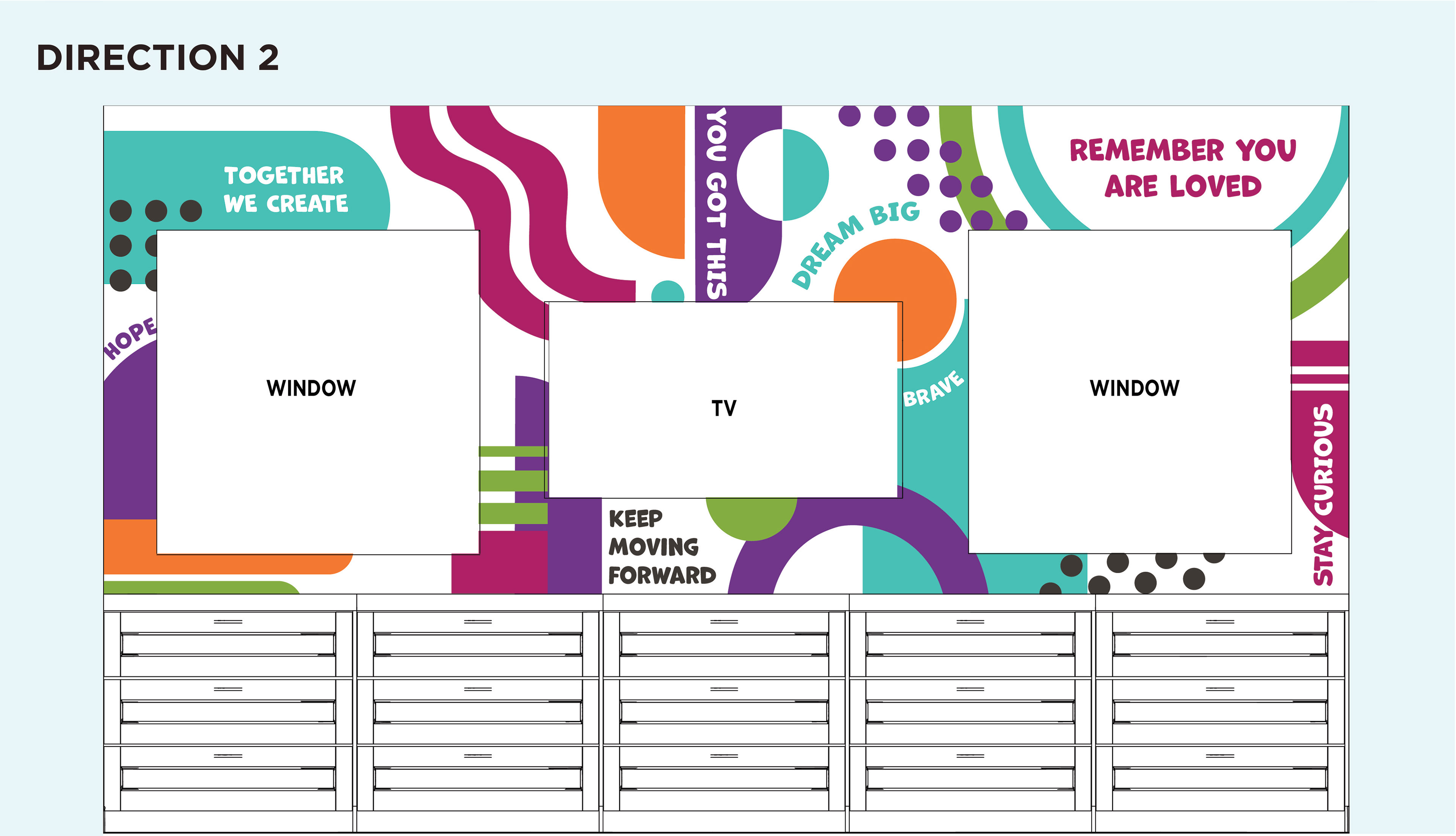 After receiving the first mockups, Star House brought the two design direction mockups to their internal stakeholders including: volunteers, staff members, and residents. Based on feedback from the stakeholders, the Star House team decided to move forward with the second design direction and provided me with a new list of affirmations that had been submitted by their residents. Working with the Star House team, I made several more rounds of revisions, including extending the graphics to cover a set of windows that looked into the therapy room to provide more privacy while programming is going on.