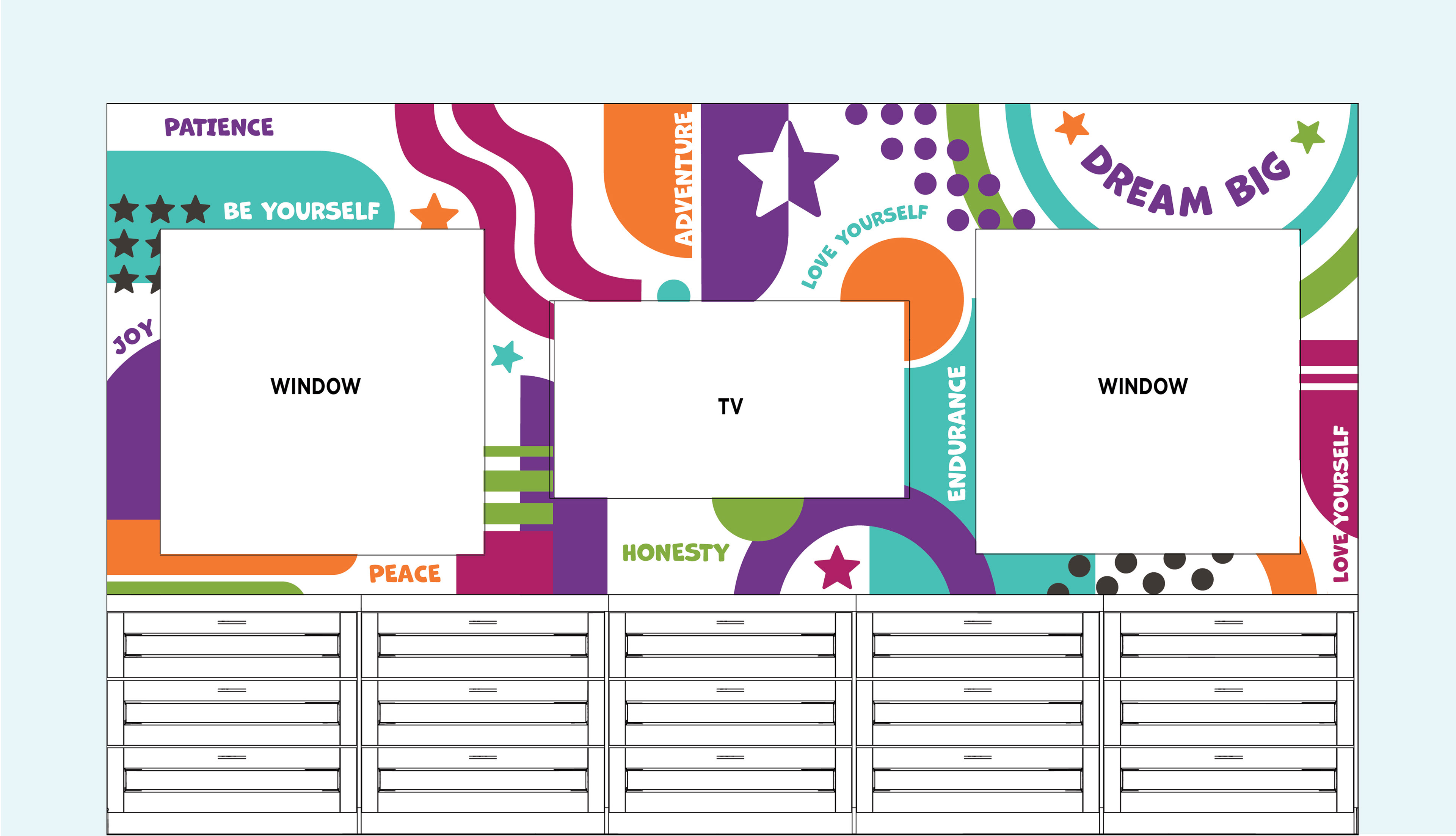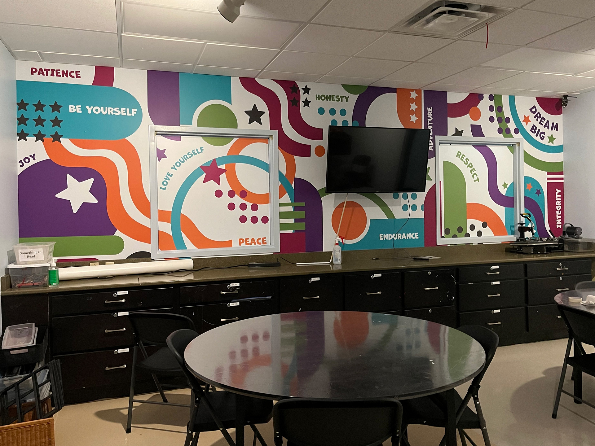 In 2025, Star House worked with King Business Interior's Connecting the Dots program to remodel their art therapy room. As part of the renovation process, a positive affirmation word cloud graphic was removed. The Star House team wanted to replace it with a larger graphic that fit their brand standards and inspired creativity in art therapy programming attendees.