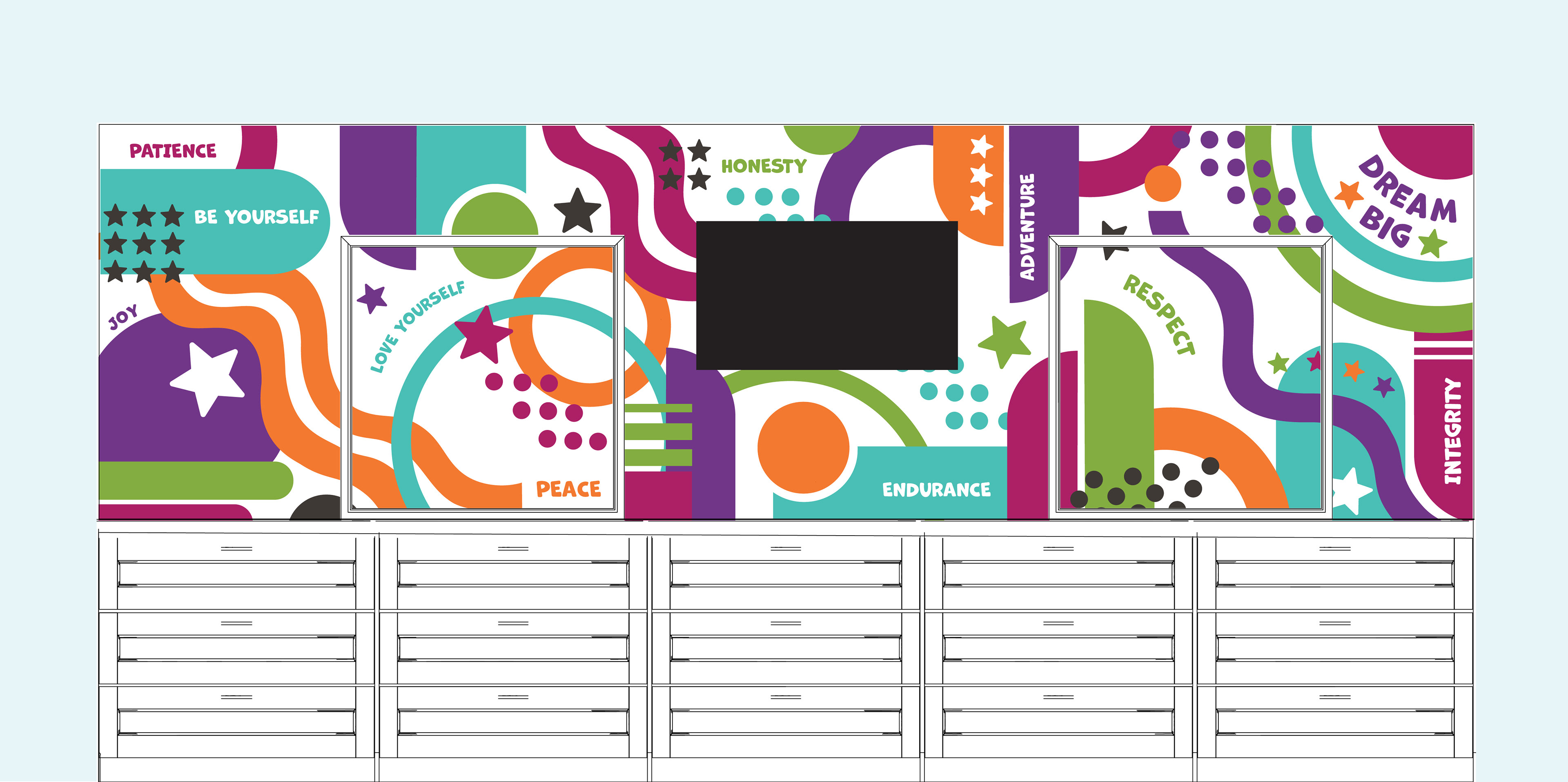 The final result is a cheerful and colorful graphic created in conjunction with Star House's stakeholders that meets their updated brand standards and provides the privacy the room was previously lacking.
