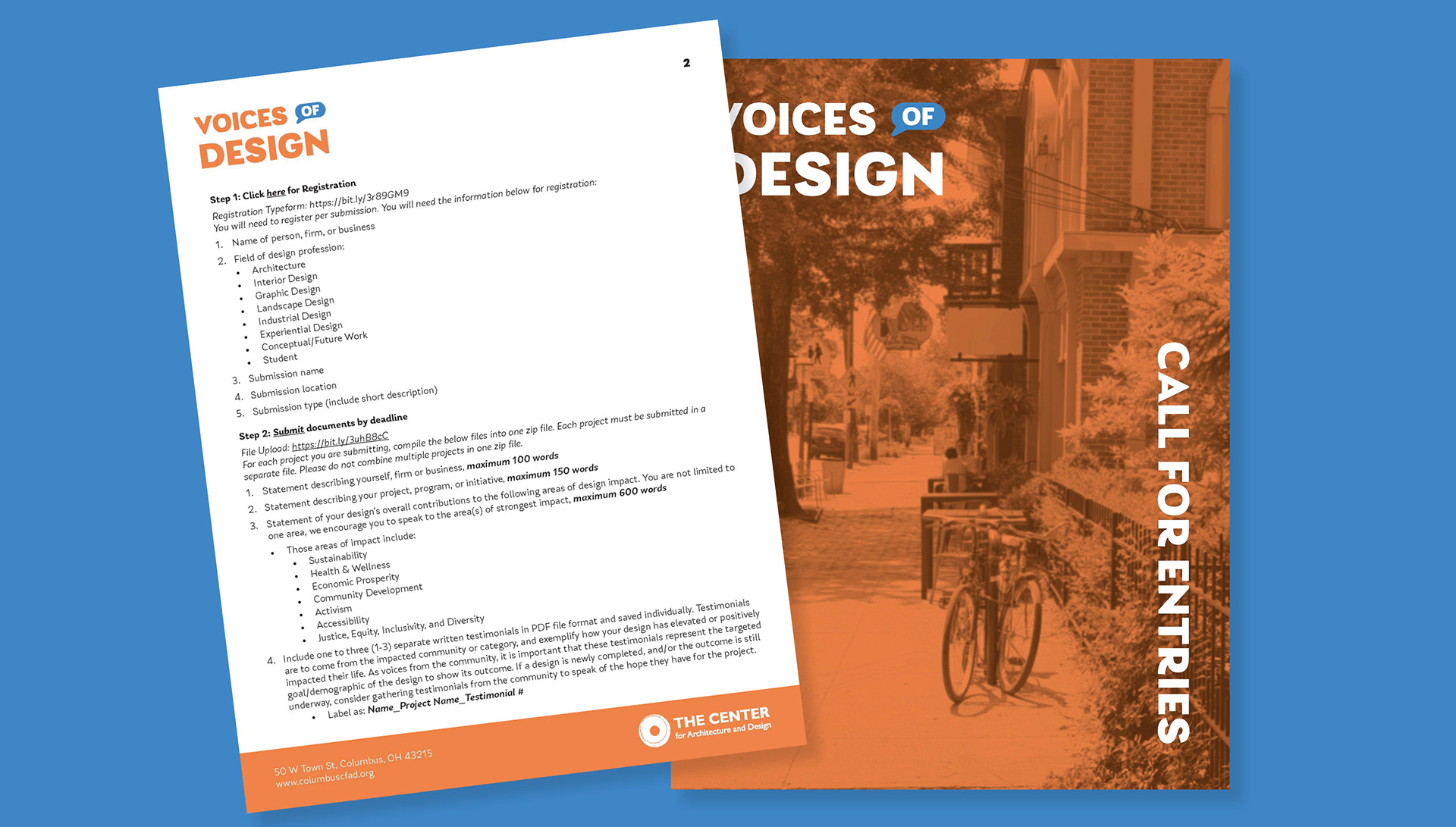 I designed collateral for two different audiences: a magazine insert available in both print and digital versions of (614) Magazine and an entry packet, website, and social media posts aimed at getting the architecture and design community involved.