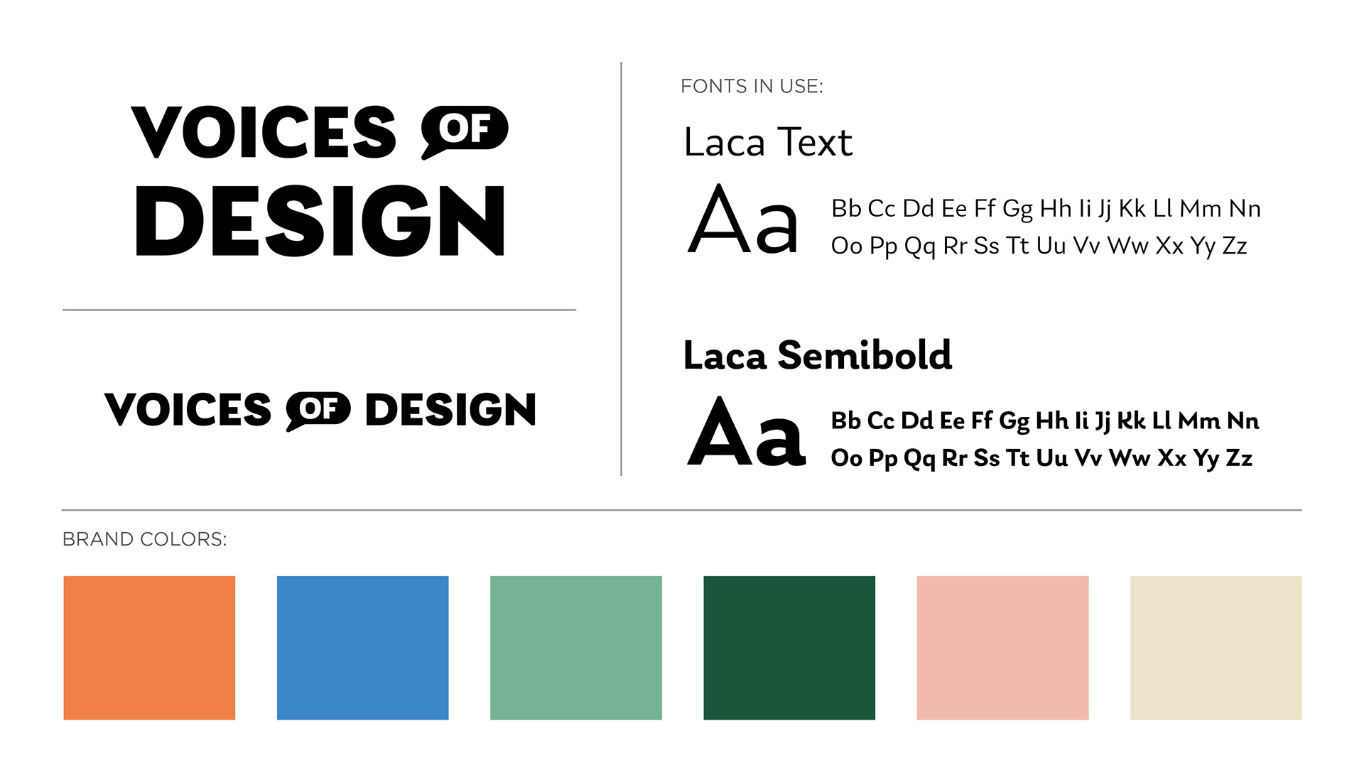 To ensure that the Voices of Design branding felt congruent with The Center for Architecture and Design, I chose to include The Center's brand orange as one of the main brand colors for Voices. Laca was chosen as the brand font due to its friendly aesthetic and readability.